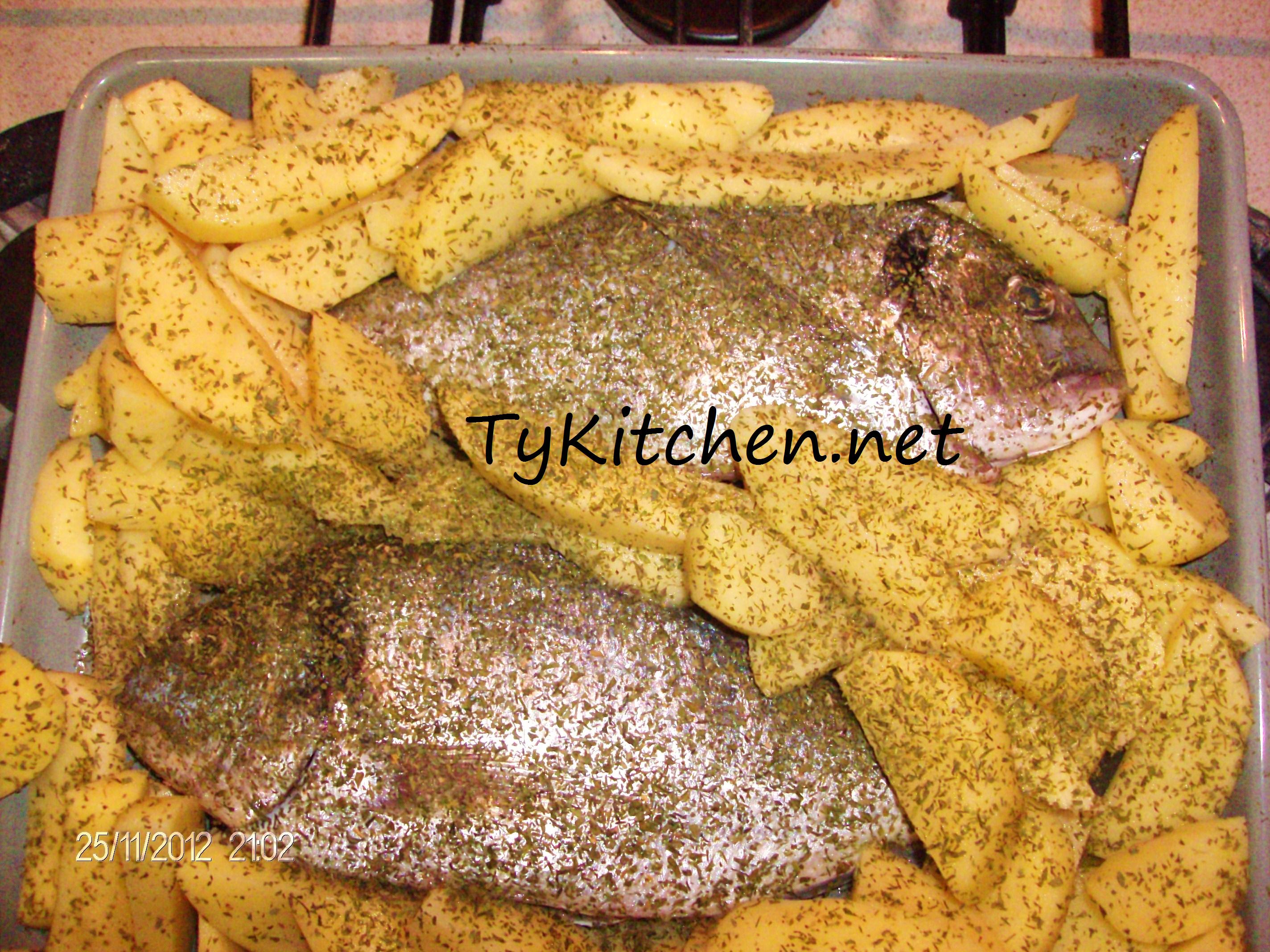 Dopo che il pesce e le patate saranno cotte togliamo la teglia e sistemiamo il tutto nei rispettivi piatti, oppure prima puliamoli e disponiamo direttamente le parti del pesce pulito.