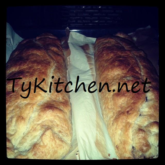 Con tanta delicatezza facciamo scivolare lo strudel dal canovaccio ad una teglia foderata con della carta da forno e inforniamolo.