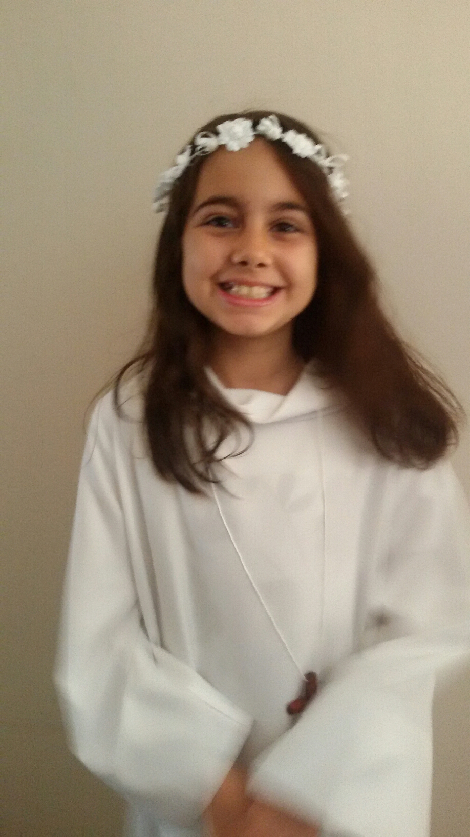 Oh, ciao ciao. La comunione di Maria è finalmente andata (domenica scorsa per l’esattezza). La speranza che avessi finalmente chiuso con catechismo, suore e catechisti si è rivelata vana. Maria vuole continuare ad andare a catechismo per tutto maggio e vuole pure fare la cresima (ma solo perché vuole essere cresima da Sara ). Preferisco assolutamente sorvolare sui 2 giorni prima della comunione e tutta la settimana dopo, vorrei dimenticare tutto quello che è accaduto, anche se so che non sarà possibile. Giusto per fare un esempio il giorno prima della comunione un altro po’ e accoppo la suora che si occupa, insieme ad una laica, del catechismo dei bambini. Insomma, credo che per riprendermi ci vorrà un anno, ma siccome questa è solo un pensiero tutto mio e dell’accaduto non mi va di parlare, chiudo qua questa parentesi, con questa foto.