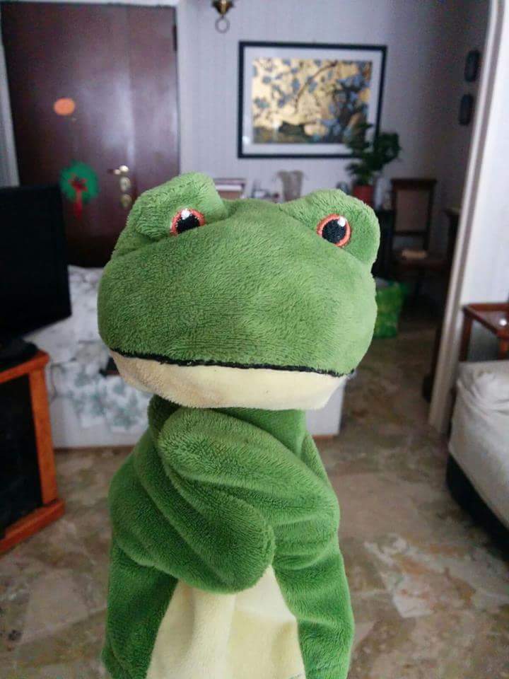 Ieri, mentre cenavamo, Frafra per convincere Ilaria a raccontarci il perché di una cosa, ha preso Spocchia. Spocchia altri non è che una rana comprata a Londra, una di quelle marionette dove infili la mano, le dita, e le dai vita. È una rana inglese, che parla come Enrico Montesano quando faceva la signora inglese all’ora del tè.