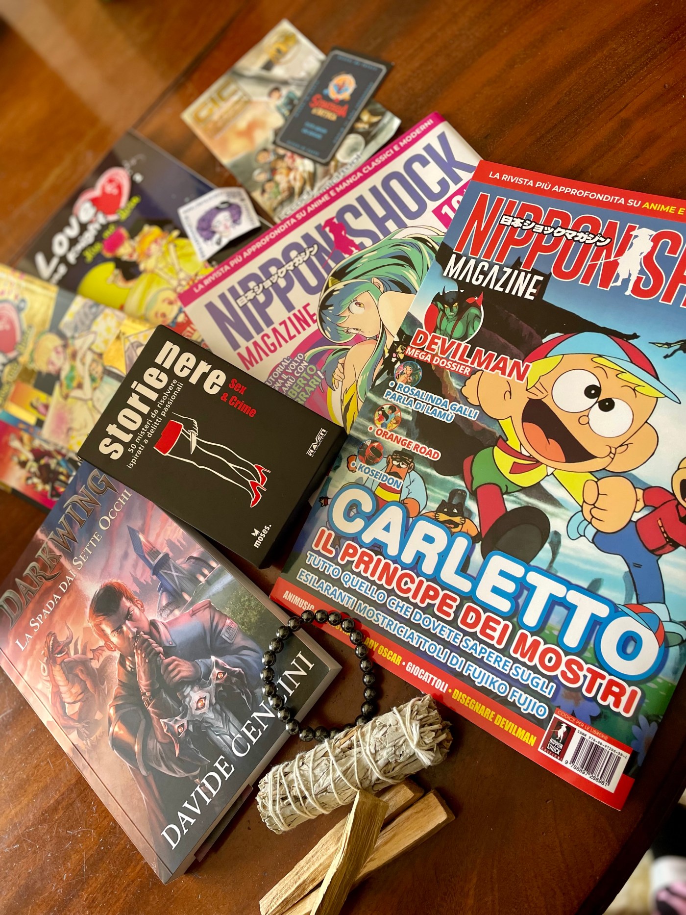 Ho acquistato del palo santo e della salvia bianca perché volevo fare un bel rito di purificazione per la casa, che serve sempre, un braccialetto in ematite che anche quello mi serve come l’aria che respiro (ma che dovrò prima purificare e poi caricare), due magazine Nippon Shock (uno del mese scorso con in copertina Devilman, e l’altro di luglio dell’anno scorso con in copertina Lamù), i primi due manga riveduti nei testi di Kiss me Licia (era d’obbligo e dopo vi spiegherò perché), le carte Crime che pensavo di poter utilizzare in famiglia e poi, come ogni volta, ho dato fiducia ad un giovane autore italiano che ha scritto una saga di libri che mi sono sembrati molto interessanti, Davide Cencini (poi vi dirò). Con l’acquisto del suo libro ho anche ottenuto in regalo anche un disegno fatto a mano sotto la sua dedica fatto dalla moglie (che ha curato le copertine dei suoi libri e che disegna divinamente) Rita Micozzi, e dal suo stand ho acquistato (per soli 6€) anche una cartolina che unisce uno dei personaggi Marvel che amo di più e un cartone animato che mi fa impazzire: Deadpool e Hazbin Hotel.